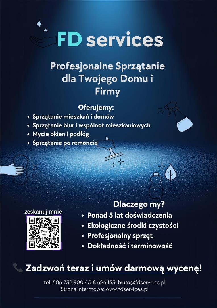 FD Services powstała z potrzeby zapewnienia profesjonalnych usług sprzątania w regionie Poznania i okolic. Rozpoczęliśmy naszą działalność z jasną misją - dostarczać najwyższej jakości usługi sprzątania. Nasz zespół składa się z doświadczonych profesjonalistów, którzy są nie tylko doskonale wyszkoleni, ale także pasjonują się tym, co robią. Korzystamy z nowoczesnego sprzętu oraz ekologicznych środków czyszczących, które są bezpieczne dla zdrowia i środowiska.